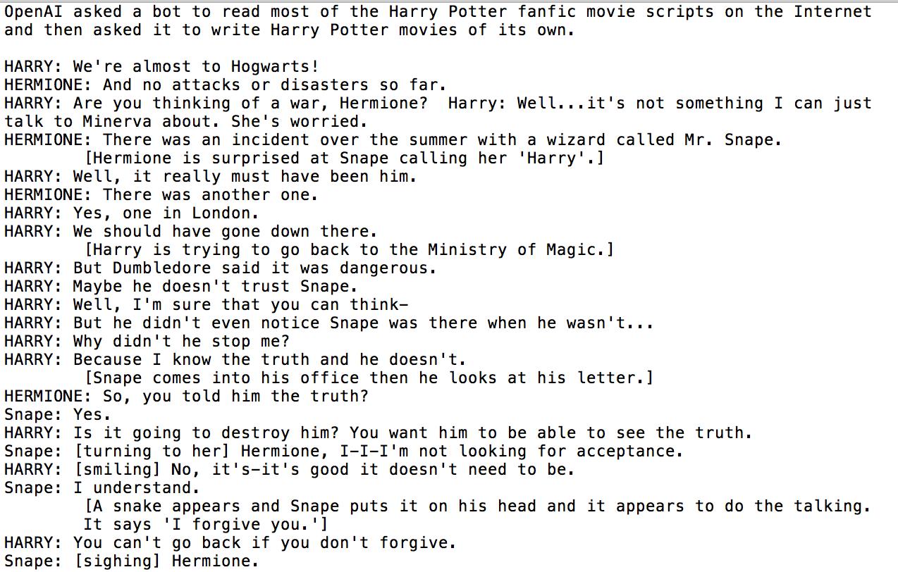 It was something that harry potter thought was very s they sheets chain lashed at harry' s ghost as he walked the grounds toward the castle. If you want your harry potter wifi names and passwords to be more creative, then check out some of the ideas on this list. Would you line up at a barnes & noble at midnight to buy a copy of harry potter and the portrait of what. Leave a like if you think it was worth it. Harry potter is a novel series written by the british author j. 'harry potter' written by a bot is gloriously illustrated by a human. Suddenly it was easier to write scenes, imagine them and bring suspension and romance in it. One small hand closed on the letter beside. Www.patreon.com/callmekevin twitter they made a bot write a harry potter chapter. The dark arts better be worried, oh boy!, gaining 360 retweets and over 1,700 likes (shown below, left). N shirt was just as bad as ron himself. Harry potter except it's written by an ai подробнее. Reading and recreating a chapter from a harry potter book written entirely by a robot!
